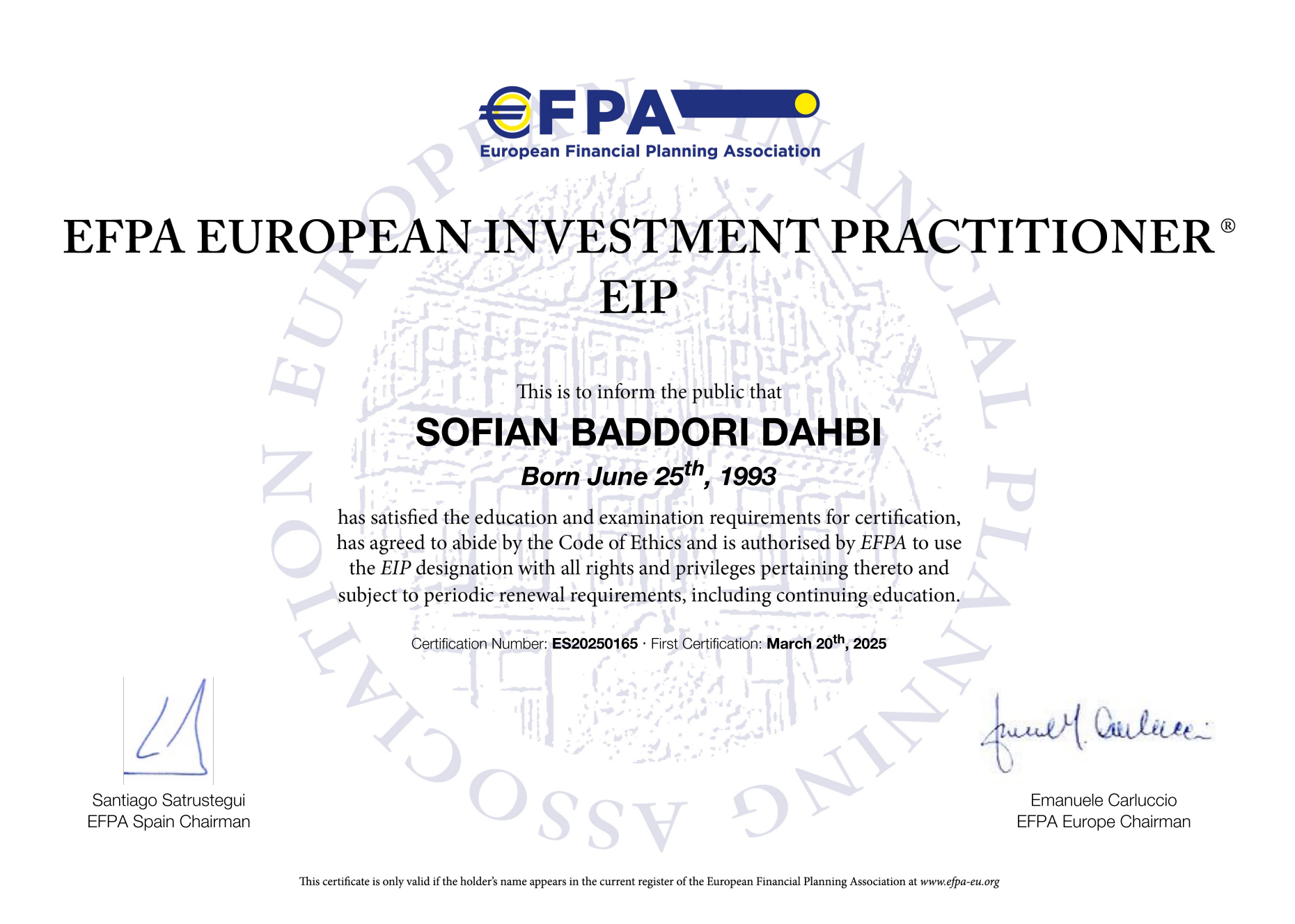 Obtuve la certificaci贸n European Investment Practitioner (EIP) de European Financial Planning Association (EFPA), una acreditaci贸n reconocida en Europa que valida conocimientos en inversi贸n, an谩lisis financiero y planificaci贸n patrimonial.